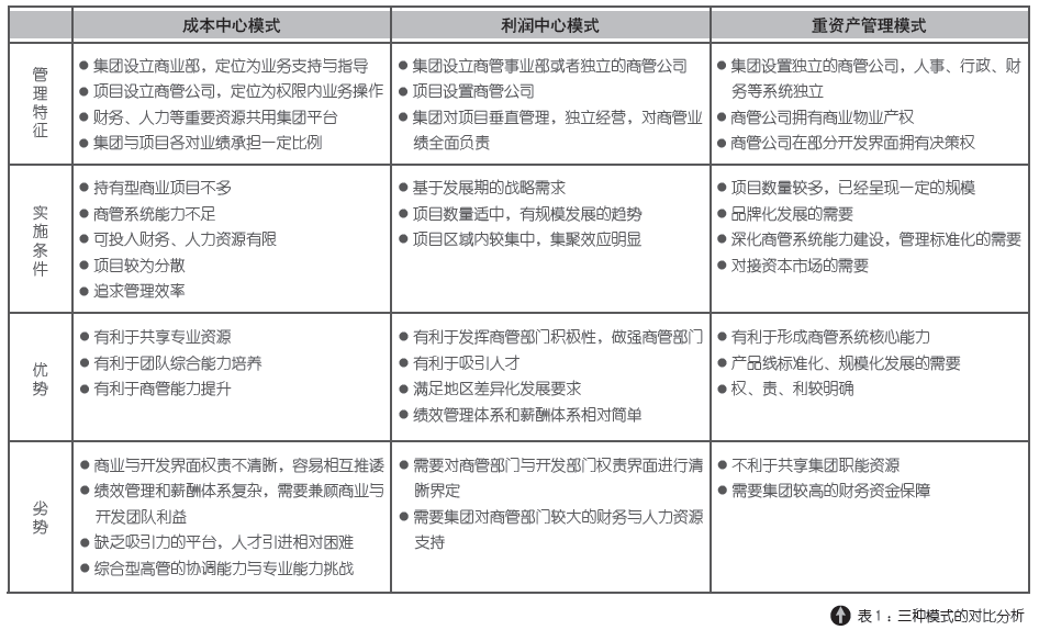 重资产管理模式:所谓重资产管理模式,主要是相对轻资产管理模式而言的,主要是以商业物业的产权转移为标志。在利润中心模式下,商业物业的产权归属城市公司或者项目公司;在重资产模式下,商业物业产权归属商业地产事业部或者商管公司。是商业地产开发走向成熟阶段的标志。(表1)