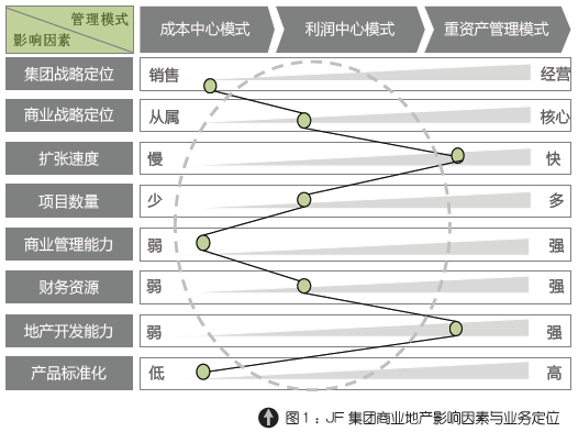 对于商业管理部门适用的不同业务定位模式,没有绝对的统一标准,这与企业本身所处的发展阶段、商业地产的业务战略、区域布局、资源保障能力等都有一定的关系。项目组通过分析下图1 所示影响商业地产业务定位的因素,结合JF 集团业务现状,对商管业务定位进行评估。