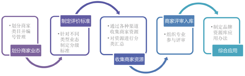 在收集到一定的资源信息后,招商部门要对商家进行认证评估,评估按前述建立的标准,由评估小组对多家商户进行打分。对于评估后符合条件的商家按分类、分级别纳入品牌资源库,初步建立起商业项目品牌资源库。