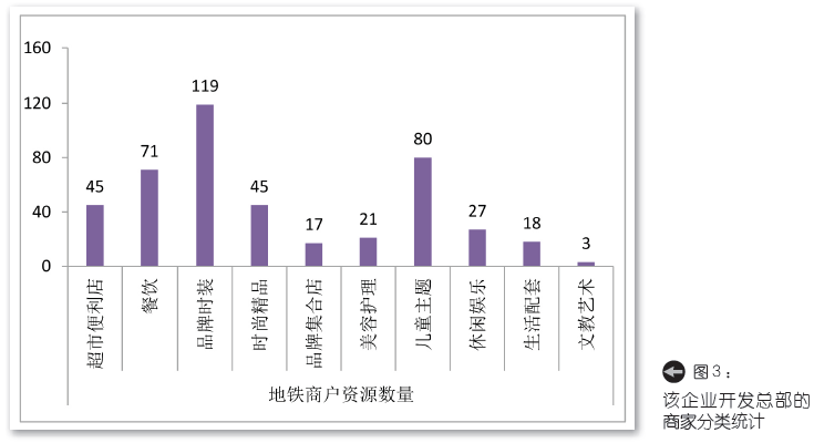 从上图中看出,该企业开发总部对品牌时装、儿童主题、餐饮类别的商户资源积累较多,而文教艺术、品牌集合店、生活配套等商户资源较少。为了进一步精准定位,该公司对数量较多的品牌资源进行了细化,如“超市便利店”类进一步细分为“大卖场、精品超市、便利店”三类,根据功能、面积要求等匹配商业物业的定位;针对数量较少的品牌资源进行了整合,如“文教艺术”类商户,后期在招商过程中整合至“休闲娱乐”大类中, 由同一批人员进行招商。