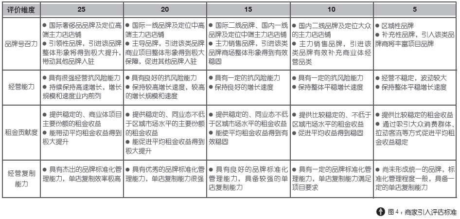 在初次引入商家资源的过程中, 总体上可从品牌号召力、经营能力、租金贡献度、经营复制能力等维度设立分级评价标准。在评价过程中,该企业开发总部组成了评估小组,对比同业态小类中的多个商家的比较排序打分,同业态品牌按得分高低进行排列,达到合格标准的商家纳入资源库。