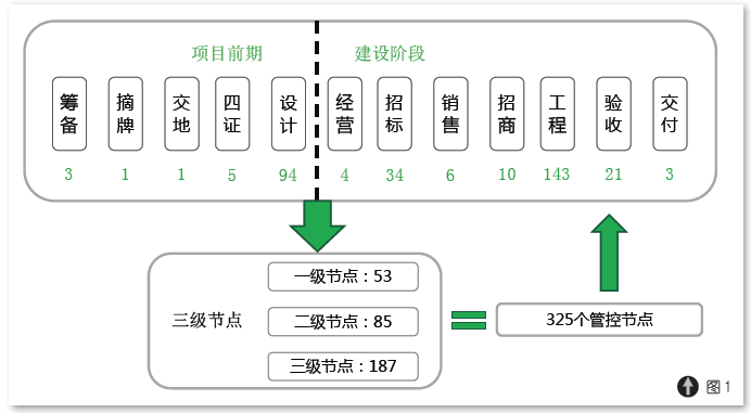 计划分级管理是房地产行业的通行做法,万达也不例外。以22 个月的项目标准计划模板为例(图1), 涵盖了325 个节点,包括53 个一级节点,85 个二级节点,187 个三级节点。各节点分为筹备、摘牌、交地、四证、设计、经营、招标、销售、招商、工程、验收、交付12 个模块中。