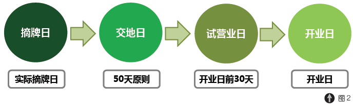 例如,万达项目开发计划节点的模块化设置,核心基于四个基准点数据。先确定摘牌日、交地日、试营业日、开业日四个关键节点,根据各节点倒排整体项目开发计划。其中,明确并严格约束了交地日的计算标准:如果实际交地时间小于摘牌日后50 天,交地日为摘牌日,反之交地日为摘牌日后30 天。这一计划管理细节对于加快交地发挥了正向引导作用,也避免了扯皮推诿问题(图2)。