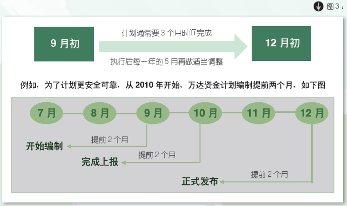 例如,资金计划通常要3 个月时间完成,为了计划更安全可靠,从2010年开始,万达资金计划编制提前两个月,执行后每一年的6月再做适当调整(图3)。