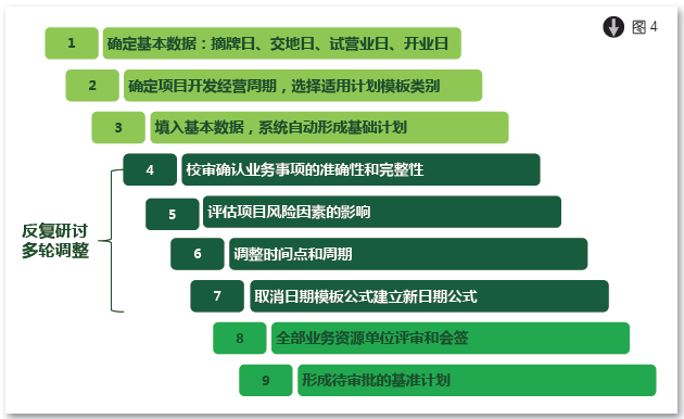 例如,一般而言,万达的项目开发计划要经过9 个环节,其中中间4 个环节是计划反复论证的过程。例如在选择模板形成基础计划之后,要校审确认业务事项的准确性和完整性、评估项目风险因素的影响、根据评估调整时间点和周期、重新建立新日期公式等。通过计划编制过程的标准化,尽可能的平衡了模板标准化与项目个性化之间的矛盾(图4)。