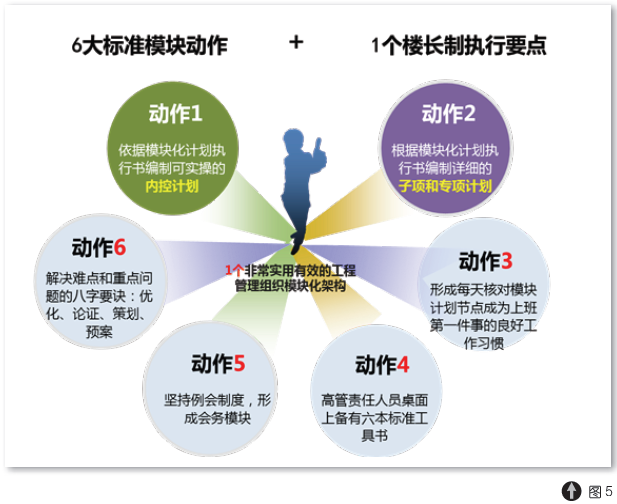 计划是一种有效的工具,计划编制并非止于集团层面或项目公司高管。以万达某项目公司为例,在一二三级计划模板的基础上,继续分解编制内控计划和子项/ 专项计划, 并结合计划执行提炼归纳为六大标准模块动作加一个楼长制执行要点,这套模式得到了集团的充分认可并全集团推广(图5)。