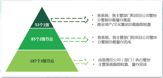 万达一方面明确规定了各级节点的主责组织,一级节点由各系统、各主管部门和项目公司管控,分管副总裁督办落实,商业地产集团总裁及文化地产集团总裁跟踪检查。二级节点由各系统、各主管部门和项目公司管控,分管副总裁督办完成。三级节点由各责任公司(部门)执行管控,主管系统跟踪检查、督办完成(图6)。