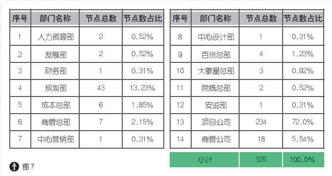 另一方面,除了明确各级节点管控责任之外,每个节点都有明确的主责部门。例如规划院负责43 个节点、商管公司负责18 个节点等(图7)。