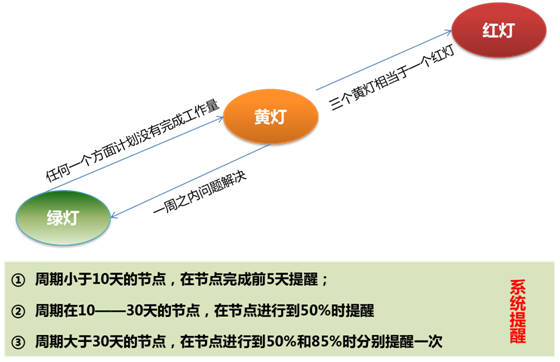 万达红绿灯制度作为破解这一问题的有效工具,已得到业内的广泛认可。而计划管理信息系统的应用, 则大大提高了红绿灯考核的实施性。所有计划节点编入信息系统,有一周任何一个方面计划没有完成工作量,自动亮黄灯;黄灯亮了再一周,还没有解决问题,就是红灯;红灯根据一二三级不同级别的节点不同而进行处罚;黄灯亮了之后如果处理好之后,自动转化为绿灯。为防止一年中出现多次延误,万达还规定亮三个黄灯等于一个红灯,不同级别节点都规定了具体的处罚措施(图8)。