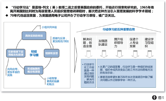 其实, 无论是麦肯锡的“ 照镜子”会还是赛普在万科某城市公司“行动咨询”,都是应用了上世纪八十年代通用电气的杰克• 韦尔奇在公司内部推行的称之为“群策群力(Workout)”的行动学习法,其咨询范式是将顾问的角色从一个方案的制定者变革成为一个群体方案的引导者。当然,不仅仅是技术性引导,更是一种方法论和一套体系,融合咨询、培训和教练,在解决问题的同时发展团队能力,其优势如图5 所示: