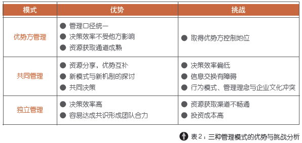 通过以上分析可以看出,优势方控制管理和独立管理模式下的项目合作开发,在管理上相对比较简单、清晰。独立管理模式在资源获取上较少的依靠母公司,给自身在资金、人力、技术等方面带来一定的瓶颈,同时为获取资源需要更多的投入;优势方控制模式下依靠优势方母公司, 这一方面的限制相对较小。