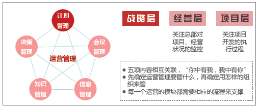 从经营层和项目层两个层级上,分别关注总部对项目、经营状况的监控和项目开发的执行过程,具体包含计划管理、会议管理、流程管理、知识管理、决策管理五项内容,这五项内容相互关联,“你中有我,我中有你”。房地产企业要先确定运营管理要管什么,再确定用怎样的组织来管以及每一个运营的模块都需要哪些相应的流程来支撑。从公司运营角度基于每个项目的运作情况、每个公司的运作情况来做适当的调配以应对市场。