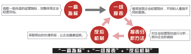 ◆“ 一组反应机制”——根据业务需要,建立管控模型,通过对企业经营现状进行分析,找出企业的病症;采取相应的处理手段,让企业健康运转。具体形式可遵循召集会议、调整计划、修改流程、变更权责、变革组织进行。
