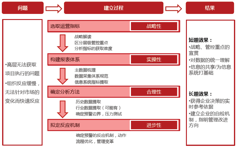 整个运营指标体系一定是建立在强烈的指向性和目的性上,故第一步须从问题入手,本着加速优化的原则逐步从选取运营指标、构建报表体系、确定分析方法到拟定反应机制,直至运营指标体系的建立,并对其结果进行有效的监控,以此进行必要的回顾和修正。具体如图: