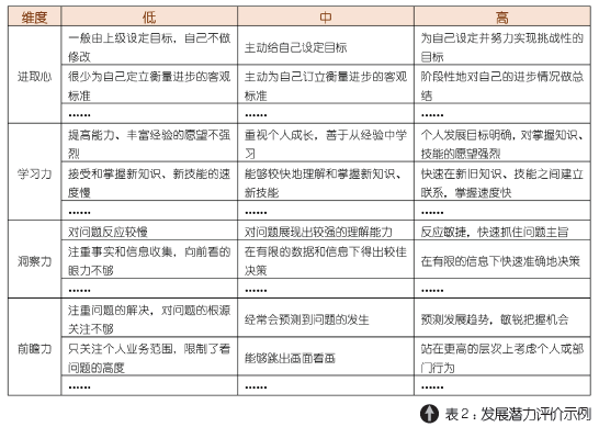 随着VUCA(复杂、多变、模糊且充满不确定性)时代的到来,以能力来评估和任免人才显然已经不够。同一个人,目前成功担任某一职务,并不意味着他在新职务上也能成功, 因为岗位职责、合作对象、管理范围、团队成员等都会发生变化。因此除了关注业绩表现和关键经历之外,还要关注是否具有学习和运用新能力和知识的潜力。(表2)