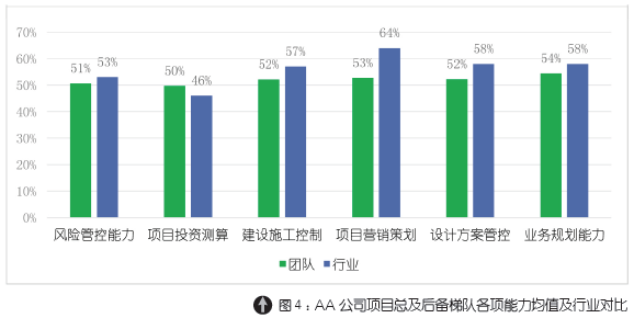 从AA公司现有项目总及后备梯队人才在风险管控能力、项目投资测算、建设施工控制、项目营销策划、设计方案管控、业务规划六项能力上的测评成绩可知,相对而言业务规划表现较好,而项目投资测算表现略差。与行业均值相比,设计方案管控和项目营销策划还有待提升,但这可能与此次参与测评人员的工作经历和背景有关。
