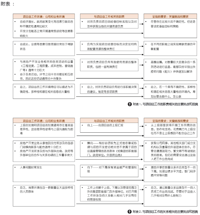 从项目总所处的公司和业务环境出发,通过梳理项目总在工作职责和关系处理上表现出的共同的关键挑战和困境(见附表1),同时结合咨询过程中对各类项目总的大量访谈和对标,以及得益于对赛普地产学院第一期房地产项目总经理研修班表现优异人员的观察,以下这些特质将有助于项目总应对来自职责和关系方面的挑战和困境。