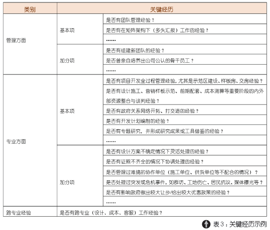 关键经历决定员工向上一级再发展需要多久以及尚欠缺哪些经验。通过历练成长是发展项目总的重要手段,因此在对项目总的培养、任用时需重点关注、盘点其关键经历。(表3)