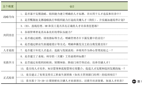 基于人才加速培养模型的五大方面,赛普细化出人才加速培养的Q12(表1),并细化为24 个更具体的维度。根据上述赛普人才加速培养模型、人才加速培养Q12 的五大方面,结合中粮案例进行阐释。