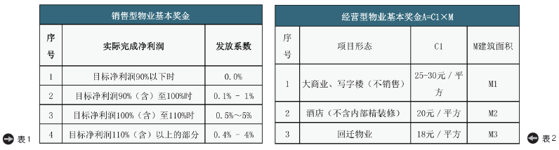 项目激励总额确定一般有两种方法,一是与项目销售额或利润额挂钩,从销售额或利润额中提取一定的比例作为项目激励总奖金包,通常用于销售类型物业,另一种是与项目建筑面积挂钩,每建造一平米,对应一定金额的激励金额,通常用于持有型物业。奖金包与销售额挂钩比较透明,便于计算,与利润挂钩需要核算出项目收入、成本、费用与利润,核算出的利润员工不一定能理解和接受,我们一般建议采用与销售额挂钩的奖金包。下图是某企业项目奖总额确定方案(表1、表2):