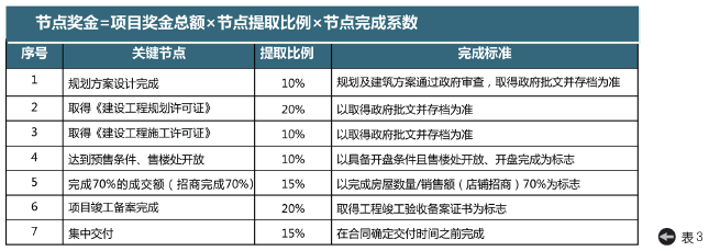项目奖发放通常与开发节点对应,挑选项目开发过程中的关键节点,设定每个节点对应的奖金包提取比例,完成节点,发放对应的奖金。节点的数量选5-8 个比较合理,不宜多也不宜少,节点多,每个节点对应的激励奖金少,激励效果不好,节点少, 奖金发放周期拉长,激励时效性不好。节点数量确定应考虑时间因素, 应确保项目奖在开发周期内均匀分布。有些企业还关注节点完成的及时性,节点是否及时完成作为节点奖金浮动参数,设定完成标准(如延期2 天完成算准时完成),达到标准获得全额奖金,超过标准获得额外奖金(如提前10 天完成),未达到标准扣减或取消节点奖金。下图是某企业的节点及对应项目奖金比例。(表3)