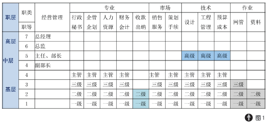 以A 企业为例,在各部门相同职级基本持平的薪酬结构下提升技术条线三个重点部门( 设计、工程和成本) 的员工待遇,在三个部门内部设置高级岗位,开辟高级技术晋升通道,降低了收款出纳、资料员的员工待遇水平,初步建立了岗位薪酬体系。如图1 所示: