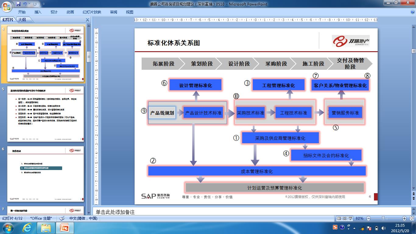 第一阶段:成本管理和采购招标及供应商管理专业标准化先行:成本管理与采购的合约规划有比较密切的关系,并且是其他模块开展的基础,因此建议先行开展,通过统一成本科目、完善目标成本测算模型,建立成本科目与合约规划的对应关系,利于动态成本的监控和采购目标成本的落实,同时也对设计阶段对标指标及成本优化提出要求,为技术标准的框架设 计提供支持;