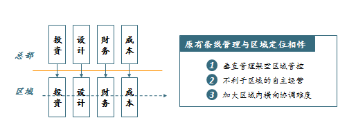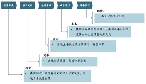 区域公司在定位上与之前有所变化,由“桥梁”转变为项目的直接管理者,总部如何管控各区域公司,赋予区域公司何种权责则成为亟待明确的关键问题。从管控模式上,如果集团总部仍延续以往的“关键点操作”方式,总部对于各项目的管理难以有效覆盖,对各地未来拓展也会有所束缚。同时区域公司分担总部项目管理的作用也势必被削弱。