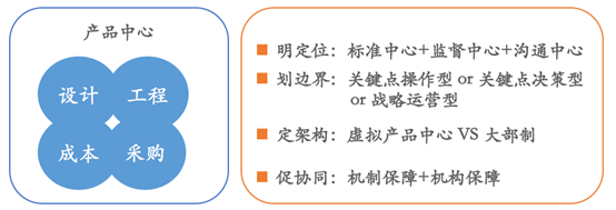 在产品委员会的领导下,以现有的设计、工程、成本、招采专业整合,形成产品中心(产品委员会定位为企业的产品最高决策机构,集合公司专业力量资源)。产品中心定位为公司的产品研发平台、产品管理机构,作为非常设机构存在,更多的是通过会议、评审等运作机制履行职能。4大部门为具体的产品管理部门,履行具体的设计、工程、成本、招采管理职能。