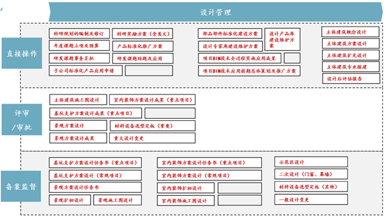 设计管理职责界面:产品研发、设计标准化及建筑方案设计由产品中心负责,以实现前端把控;其他设计事项分权管控。