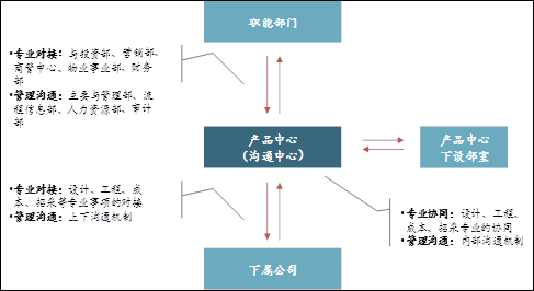产品中心整合了四大专业后,为满足项目快速开发要求,需要做好三个方向的协同功能,实现其“沟通中心”的定位:即与总部职能部门的协同、与子公司的协同、内部各部室的协同。