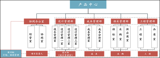 采取“大部制”管理模式,高度整合资源,在产品委员会的领导下,设产品中心,内部整合设计、工程、成本、招采专业。产品中心定位为公司的产品研发平台、产品管理机构,作为常设机构存在,下设设计、工程、成本、招采四个条线。