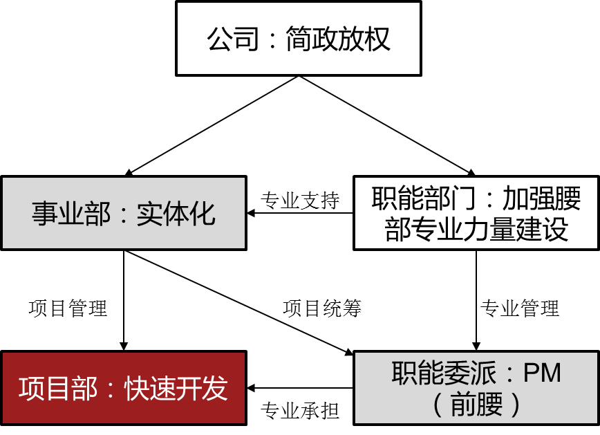 2)公司职能后台,承担产品定义工作,包括项目定位、设计、目标成本编制等工作。承担公司重大专业管理或专业决策。为了保证不因事业部实体化削弱公司整体专业水准,需要后台以专业把控为主,因此对审批质量的关注优先级大于对审批效率的关注。