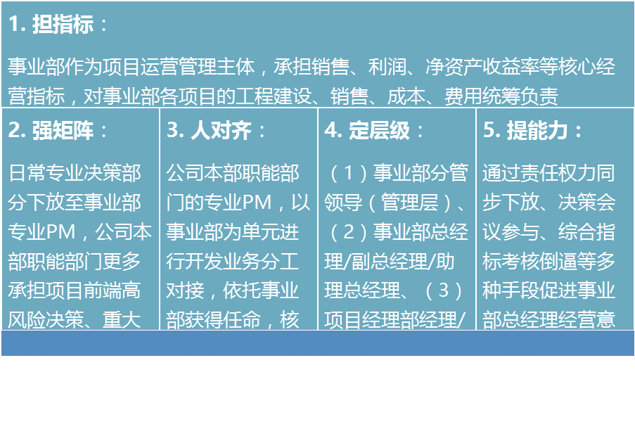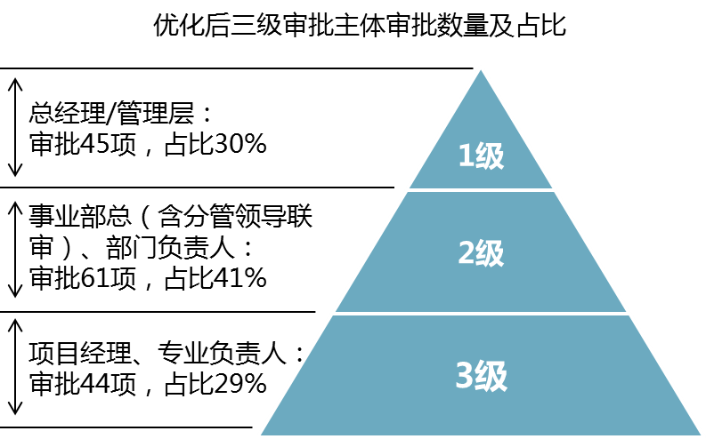 3大抓手:第一,扩大事业部责任与权限,事业部作为项目运营平台、利润实现主体,承担回款及利润等经营考核指标,责任重大,使命光荣。基于权责对等思想,在明确事业部经营责任的同时,围绕经营导向,授予相应的经营权限,实现预期经营结果。第二,整合审批层级、精简审核环节,借鉴二八原则、组织扁平化理念,依托背靠背合伙人信任文化,将四级审批、五级审批,简化为三级审批,明确总经理、分管领导、事业部总经理审批分工,减少不必要的重复审批,减少不增值的审核环节。管理层重点参与专业质量把控,或重大风险控制等关键环节审批。实现公司有限的宝贵的核心决策资源价值最大化。第三,突出职能专业支持服务,强化公司专业职能后台建设,为前台实现任务目标提供坚强的专业支持保障,构建前后台一体化的密切合作关系。弱化行政层级,突出项目运营前台的统筹拉动。事业部项目运营前台是职能部门专业专长发挥展示的实战舞台,各事业部的专业实践将促进公司的专业积累建设与整体提升,并更好地服务于事业部经营。