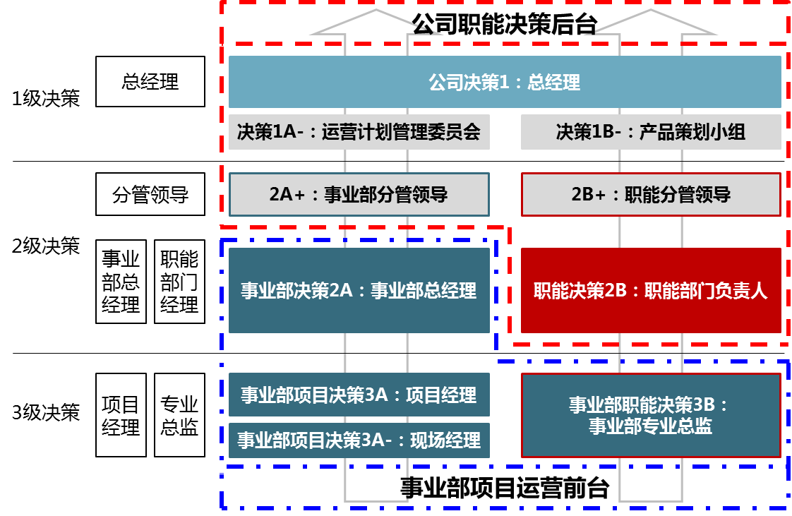3级决策。1级决策,指公司级决策,包括总经理决策,总经理授权跨部门专业小组及分管领导进行的决策。2级决策,指事业部级/职能部门级决策。3级决策,指项目级/职能委派事业部PM级决策。