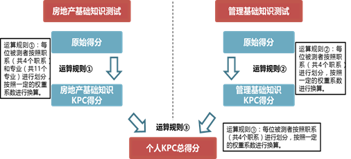 例如,某管理人员房地产基础知识测试原始得分53分,根据运算规则“总经理及以上职级,本专业得分比重为35%,强相关专业得分比重为35%,弱相关专业得分比重为30%”,换算后其房地产基础知识KPC得分为55分,比原始得分高了2分;该管理者管理基础知识测试的原始得分65分,根据运算规则“总经理及以上职级,宏观类、区域类、管理知识类得分比重为70%,企业文化、认知能力类得分比重为30%”,换算后其管理基础知识KPC得分为61分,反而比原始得分低4分,可能因为其在宏观、区域、管理知识类的题目得分不高。最终再根据“总经理及以上职级,房地产基础知识KPC得分和管理基础知识KPC得分分别占KPC总得分的50%”,计算出其最终KPC得分为59分。这样的计算方法考虑到职级、专业的不同,侧重的重点就不同,更具有科学性、合理性。