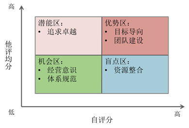 例如,对某管理者的领导力进行评估,分析后得出,目标导向和团队建设的他评均分和自评分的分数都比较高,则这两个素质即为其优势,要继续保持;追求卓越落在潜能区,即他平均分高、自评分低,后续要充分发掘自身追求卓越方面的潜力;经营意识、体系规范落在机会区,这两项还需要不断提升;资源整合是盲点,自己认为做的不错可是他人看来还没有达到要求。