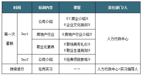对于在校大学生,目的是提前锁定优秀学生作为企业未来的储备人才,并且还能够在学生之间宣传企业,提高知名度。由于其学生身份的特殊性、工作时间的不确定性,在校期间的培养主要利用寒暑假,同时也规定实习时间的最低要求。Y房企锁定区域知名院校的在校大学生,建立奖学金,并对获得奖学金的学生提供实习机会,配套对应的实习培养方案。