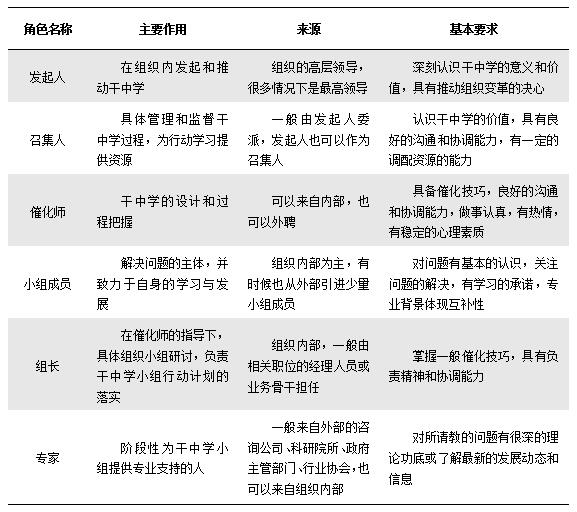 干中学的目的就是要在实际工作中,发现问题、解决问题、固化成果。以实际工作中遇到的问题为干中学任务,通过小组内的研讨,制定解决问题的改进计划并执行,最终对执行结果做总结,固化正确做法优化错误做法,在实际工作中积累学习。干中学有六个参与角色,其主要作用、来源和根本要求都有不同,如表6所示。