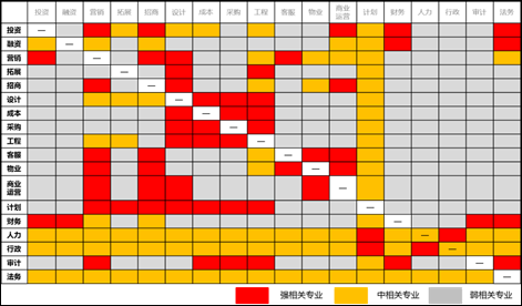 例如,作为“设计”专业来说,“成本”、“采购”、“工程”是其强相关专业;“营销”、“拓展”、“招商”、“计划”是其中相关专业;“投资”、“融资”、“客服”、“物业”、“商业运营”等专业是其弱相关专业。
