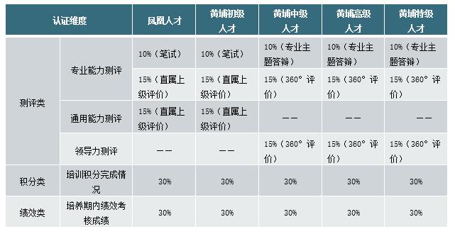 人才认证就是要综合运用测评类、积分类、绩效类三大认证方式,选取合理的认证工具,对各级人才培养周期内的成长进行评估。测评类可以是专业能力测评、通用能力测评、领导力测评。积分类即培训积分的完成情况,它也能够对培训过程起到监督作用。绩效类是培养期内绩效考核成绩。根据培养对象的不同,认证维度可设置不同的权重。人才认证是不可或缺的环节,它是对前期培养过程的总结归纳,也可以看作进入下一阶段培养计划的开端。
