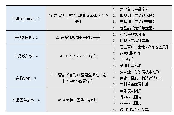 目前房地产行业所有标杆企业都已经形成了自己的产品系列和产品线,并在不同城市的不同项目上进行着标准化复制。比如万科的城市花园系列、四季花城系列、金色系列;恒大的华府系列、绿洲系列、金碧天下系列;保利的花园系列、林语系列;绿城的玫瑰系列、丹桂系列、山丘系列;华润的万象城系列、橡树湾系列等。赛普多年来一直致力于帮助中小型房企制作符合公司战略发展要求的产品标准化。赛普根据多年经验总结出来一套产品标准化的方法论,详见表1。赛普的产品标准化方法论分为4个步骤,为:“2、4、3、4”。讲究的是先有产品线,再根据对应的产品线去制定产品线的产品要求,如“设计准则”、“产品的建造标准”等。以保证产品标准化符合产品线对应产品的要求,及产品线符合客户战略发展的要求。Y房企遇到的问题,亦是很多中小型房企发展过程中都会遇到的问题。赛普项目组结合赛普的方法论,并且与客户实际相结合,针对Y房企的具体问题,规划出项目开展思路:以具体问题为导向,不做“大而全”的标准化,而是更加接地气、更符合Y房企发展的标准化。