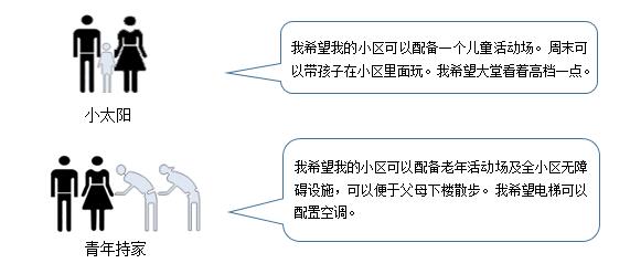 以产品配置为例,根据客户的定位,解决客户对产品功能、部品档次等不同需求的要求。使产品的配置可以更加适配不同客户对产品不同的需求。如图4所示。通过图4我们可以发现,不同的客户他们对小区的配置有不同的需求。小太阳家庭他们可能更加关注的是,孩子在小区活动的场地及安全;而青年持家家庭他们可能关注的是小区里面要有老人活动的产地及方便老人散步的无障碍设施。所以说,不同产品线的定位,面对的是不同的客户。这些客户的需求也是不一致的。所以产品配置配置要符合产品线所定义的客户需求。