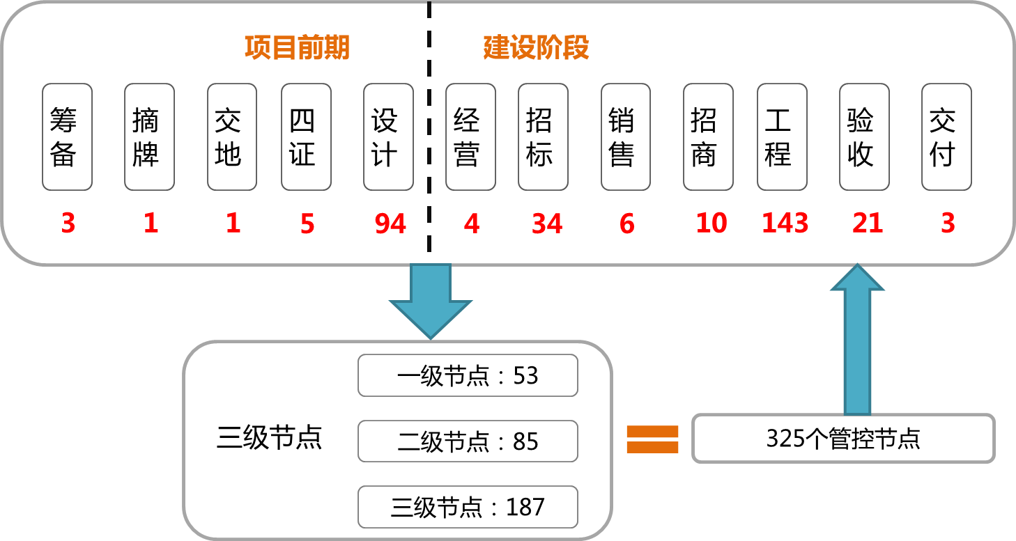 计划分级管理是房地产行业的通行做法,万达也不例外。以 22 个月的项目开发计划标准计划模板为例,涵盖了 325 个节点,包括 54 个一及节点,73 个二级节点,164 个三级节点。各节点分为筹备、摘牌、交地、四证、设计、经营、招标、销售、招商、工程、验收、交付 12 个模块中。