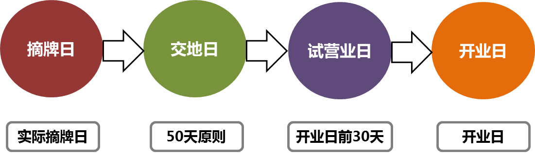 例如,万达项目开发计划节点的模块化设置,核心基于四个基准点数据。先确定摘牌日、交地日、试营业日、开业日四个关键节点,根据各节点倒排整体项目开发计划。其中,明确并严格约束了交地日的计算标准:如果实际交地时间小于摘牌日后 50 天,交地日为摘牌日,反之交地日为摘牌日后 30 天。这一计划管理细节对于加快交地发挥了正向引导作用,也避免了扯皮推诿问题。
