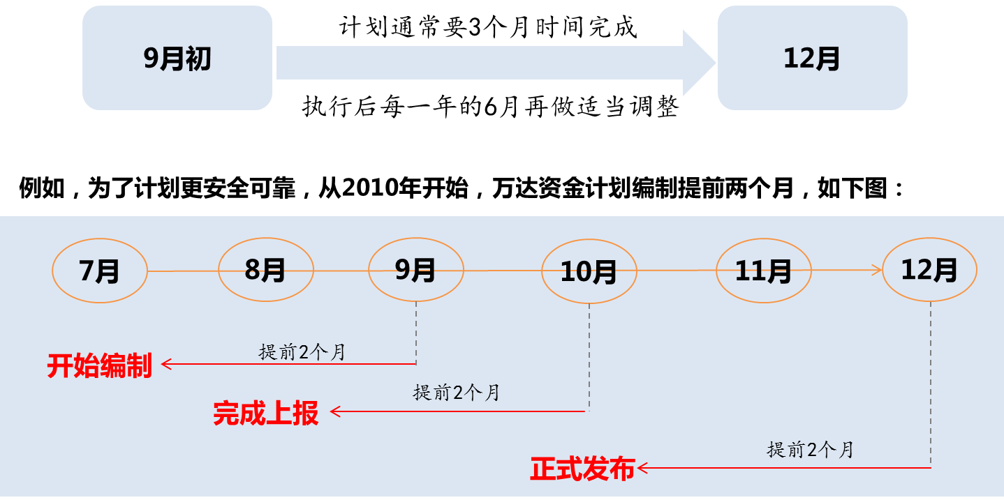 例如,资金计划通常要 3 个月时间完成,为了计划更安全可靠,从 2010 年开始,万达资金计划编制提前两个月,执行后每一年的 6 月再做适当调整。