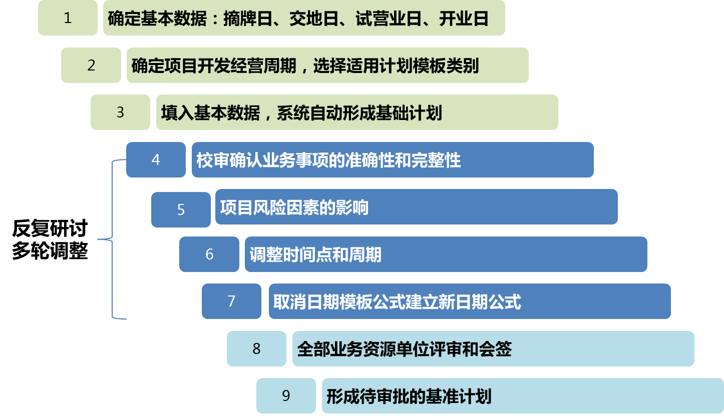 例如,一般而言万达的项目开发计划要经过 9 个环节。其中中间 4 个环节是计划反复论证的过程。例如在选择模板形成基础计划之后,要校审确认业务事项的准确性和完整性、评估项目风险因素的影响、根据评估调整时间点和周期、重新建立新日期公式等。通过计划编制过程的标准化,尽可能的平衡了模板标准化与项目个性化之间的矛盾。
