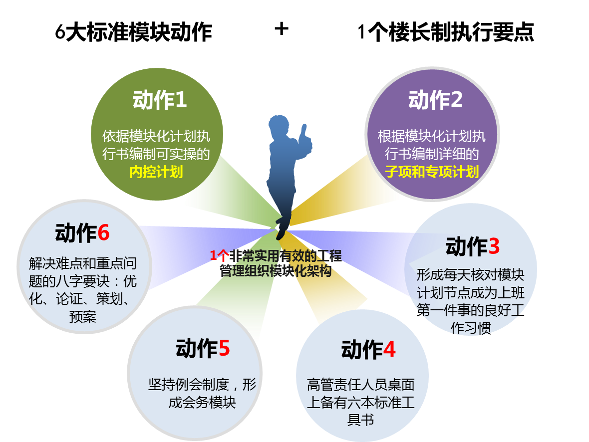计划是一种有效的工具,计划编制并非止于集团层面或项目公司高管。以万达某项目公司为例,在一二三级计划模板的基础上,继续分解编制内控计划和子项/专项计划,并结合计划执行提炼归纳为六大标准模块动作 +1 个楼长制执行要点,这套模式得到了集团的充分认可并全集团推广。