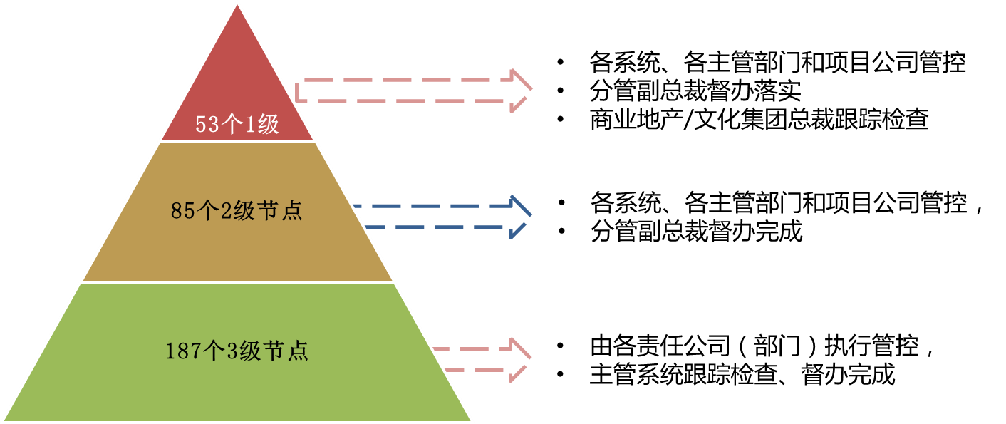 万达一方面明确规定了各级节点的主责组织,一级节点由各系统、各主管部门和项目公司管控,分管副总裁督办落实,商业地产集团总裁及文化地产接团总裁跟踪检查。二级节点由各系统、各主管部门和项目公司管控,分管副总裁督办完成。三级节点由各责任公司(部门)执行管控,主管系统跟踪检查、督办完成。