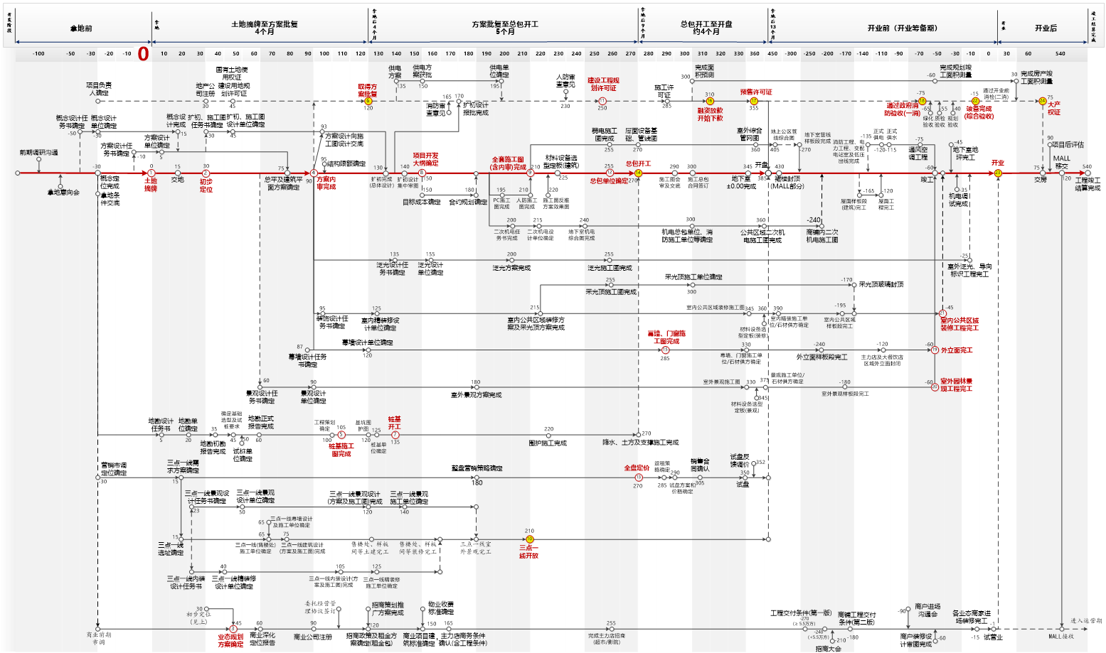 商业开发协同机制以关键开发节点为基础,通过协同总图的形式,展现各专业从项目拿地到项目开业这段时间所有关键节点的前后顺序、配合关系、节点类型,实现商业项目开发全专业、全价值链管理。同时,明确关键管控节点的管理标准,实现商业项目开发全方位管理。